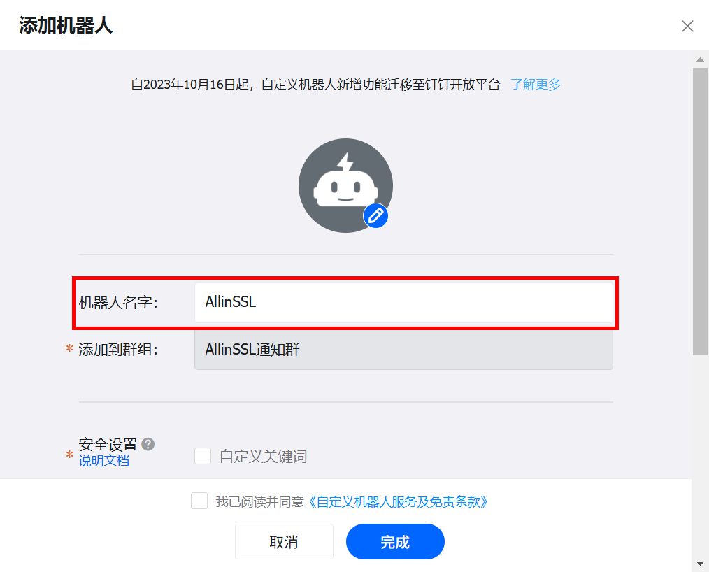 ⑥在这里可以对机器人进行一些命名和设置,填入机器人名字(如“AllinSSL”)