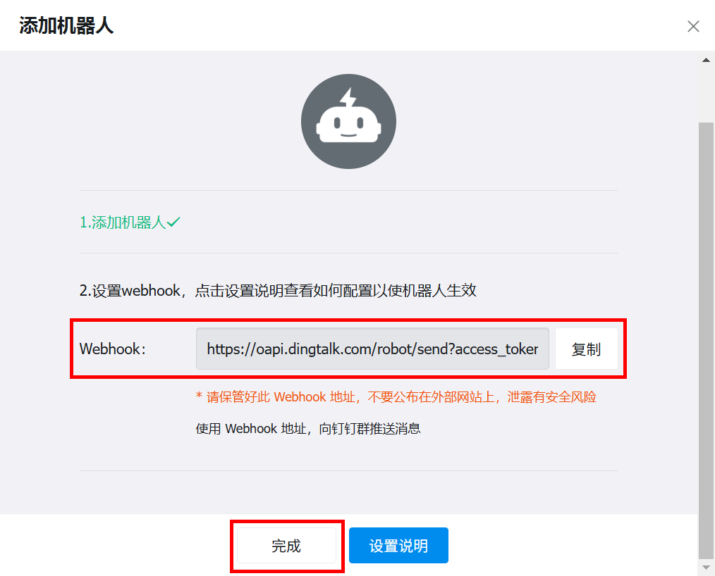 ⑧此时,钉钉自定义机器人(Webhook)就创建完成了。点击复制Webhook地址(之后要用),再点击下面的“完成”按钮