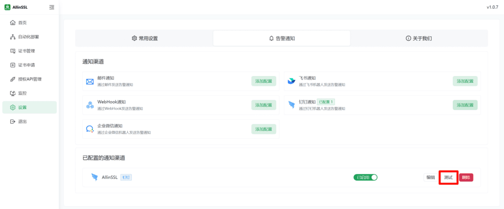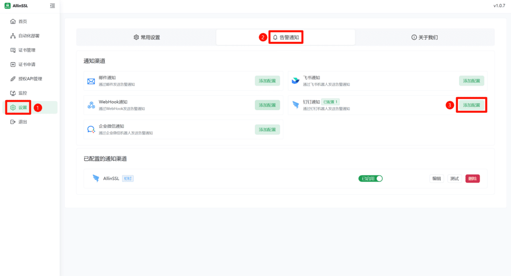 ①登录AllinSSL管理后台,点击左侧的“设置”,选择“告警通知”后,点击“钉钉通知”旁边的“添加配置”