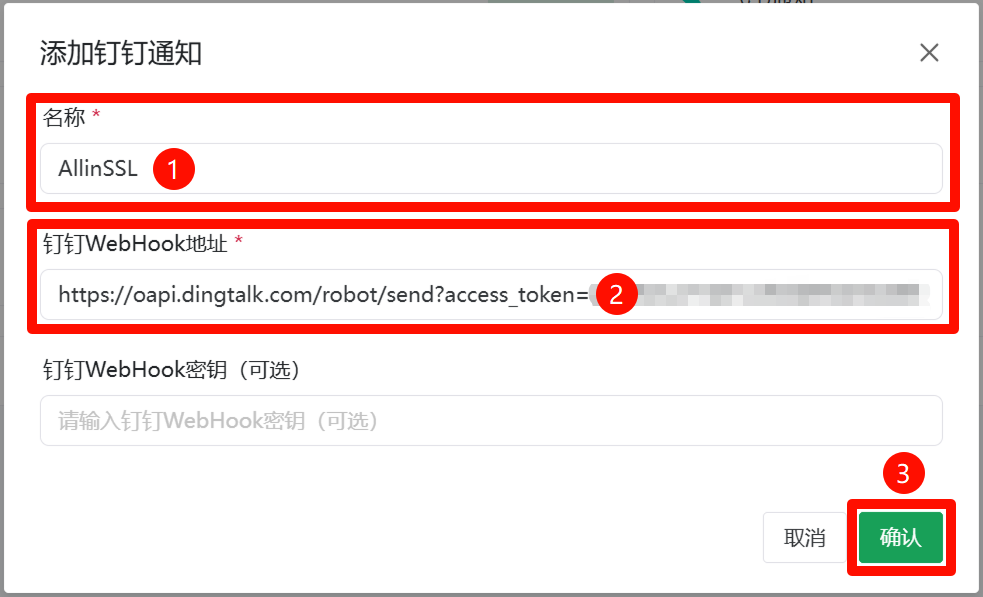 ②名称可以自己起一个(如“AllinSSL”),将刚刚复制的Webhook地址粘贴至“钉钉WebHook地址”下方,然后点击右下角的“确认”按钮