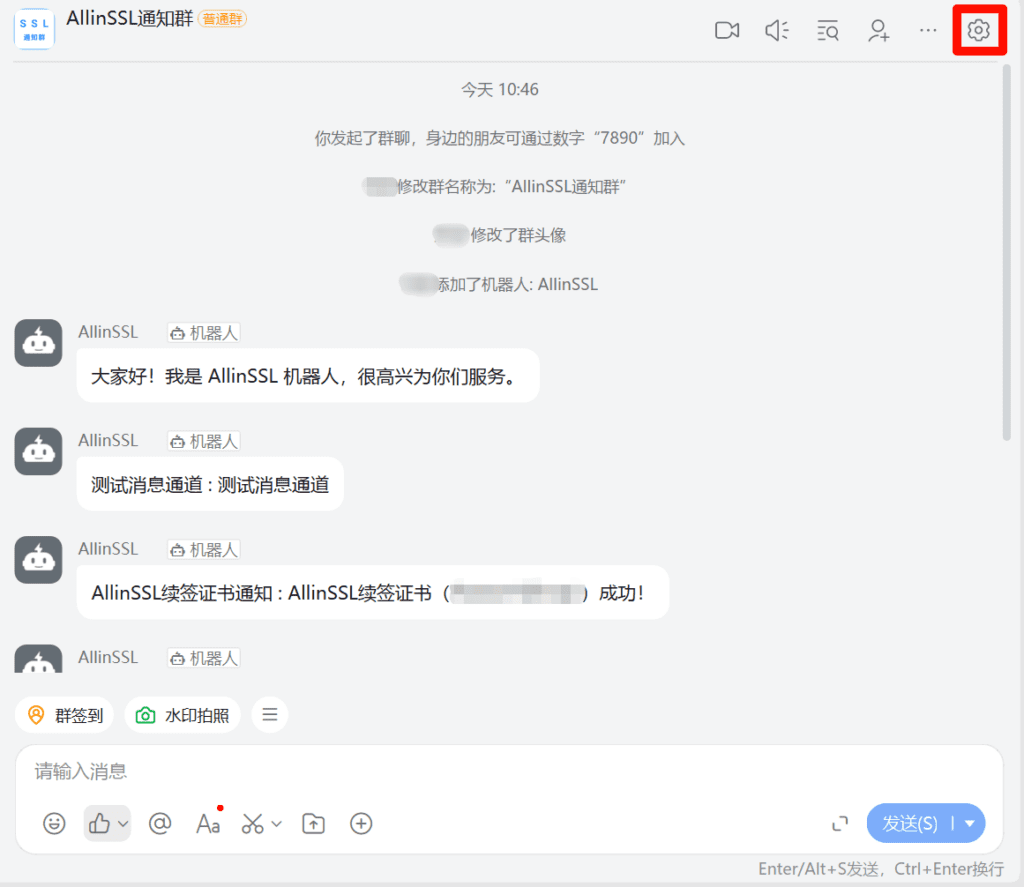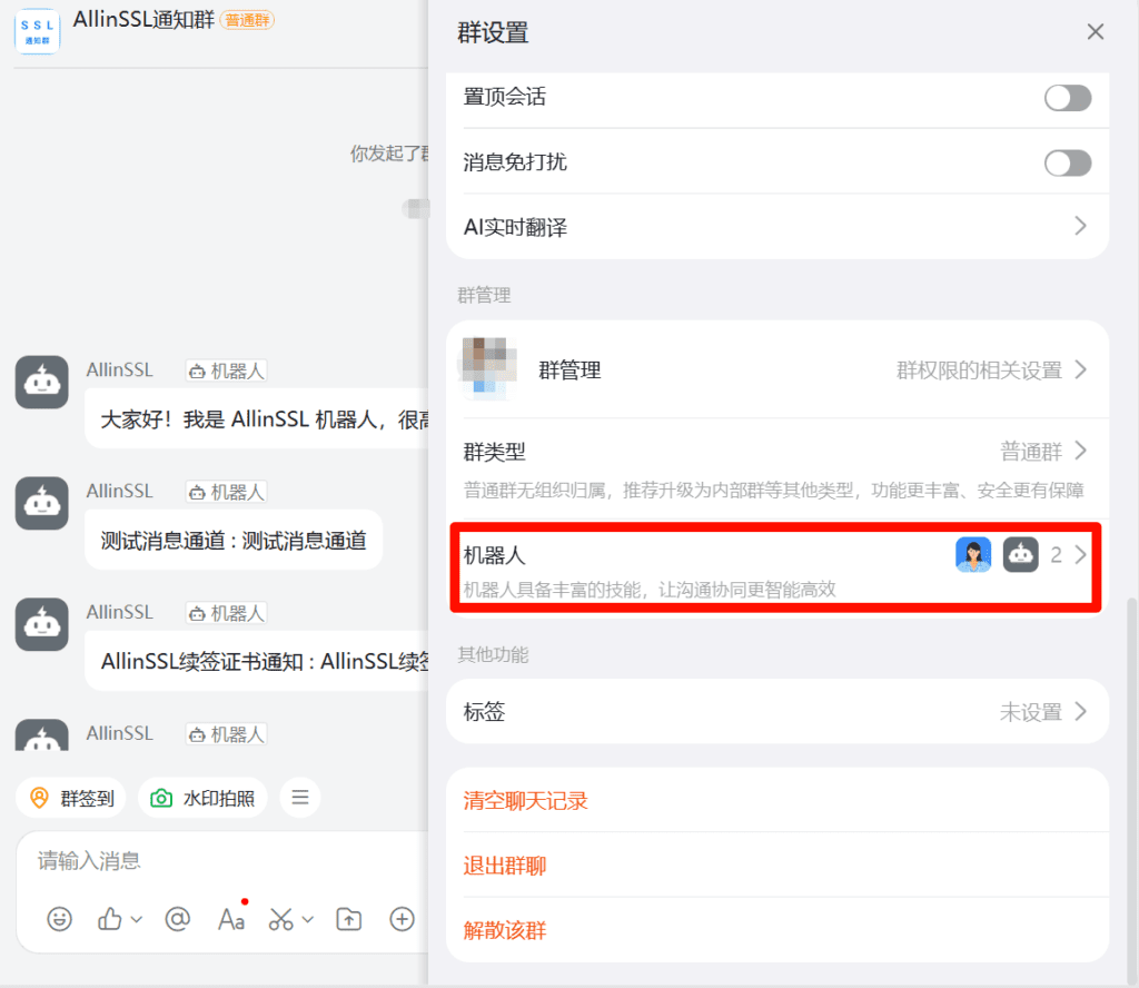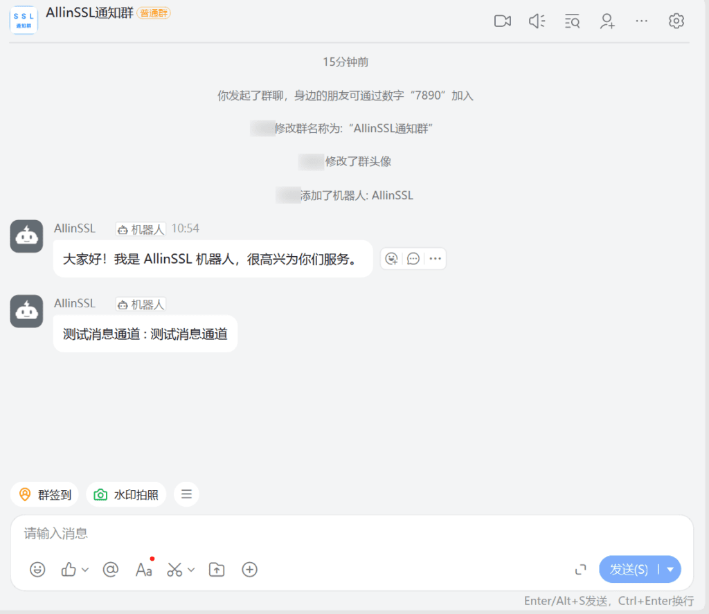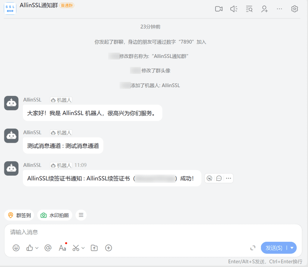 ⑤此时钉钉中的机器人应该就会自动推送一条通知,说明AllinSSL已经能成功调用钉钉群机器人的Webhook,实现发送通知的功能了