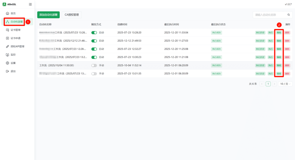 ①点击左侧的“自动化部署”,找到需要添加自动通知功能的网站,点击右侧的“编辑”按钮