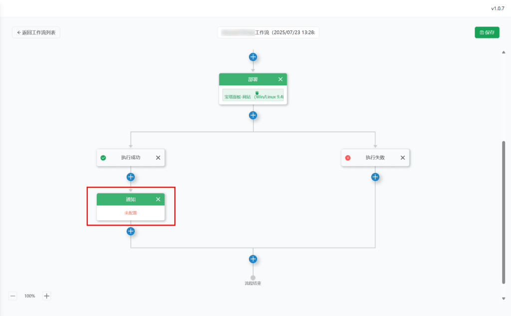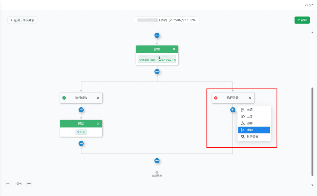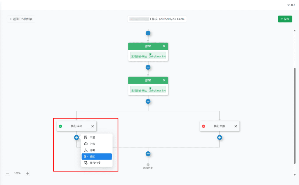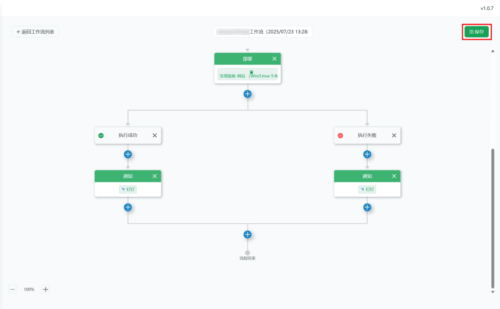 ⑥执行成功和执行失败的两个通知都添加完成之后,部署结构图已经变成如下图所示,点击右上角的“保存”