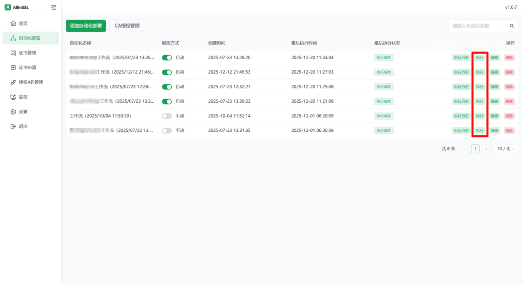 ⑦之后网页会返回到“自动化部署”管理界面,找到刚刚添加过钉钉机器人通知功能的网站,点击右侧的“执行”。稍等片刻,会显示“执行成功”