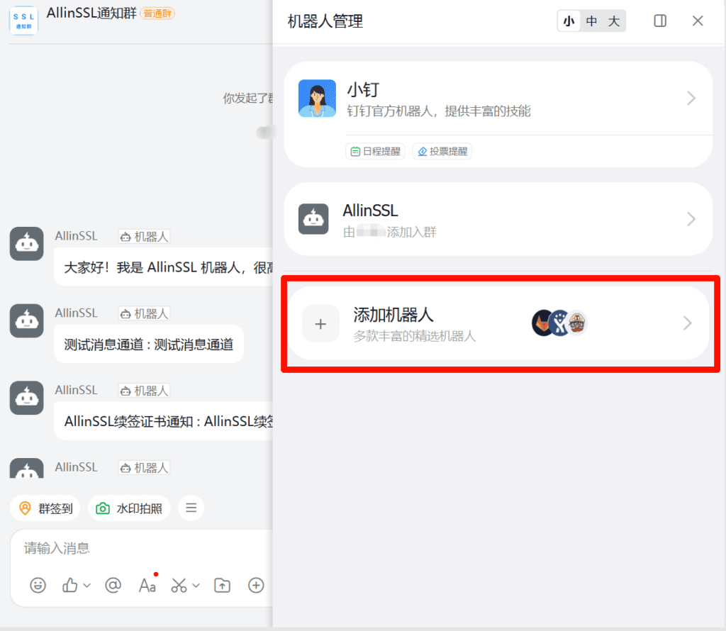 在使用AllinSSL的时候,发现AllinSSL在SSL证书申请、部署过程中可以发送通知,但一直觉得配置API会比较麻烦就没有添加。最近偶然发现钉钉群机器人的配置比较简单,而AllinSSL中也正好提供了对钉钉群机器人(基于Webhook)的支持,就进行了尝试,实现了AllinSSL中自动申请证书、自动部署证书到自动发送通知提醒管理员的闭环。